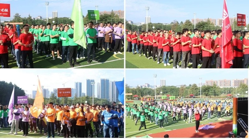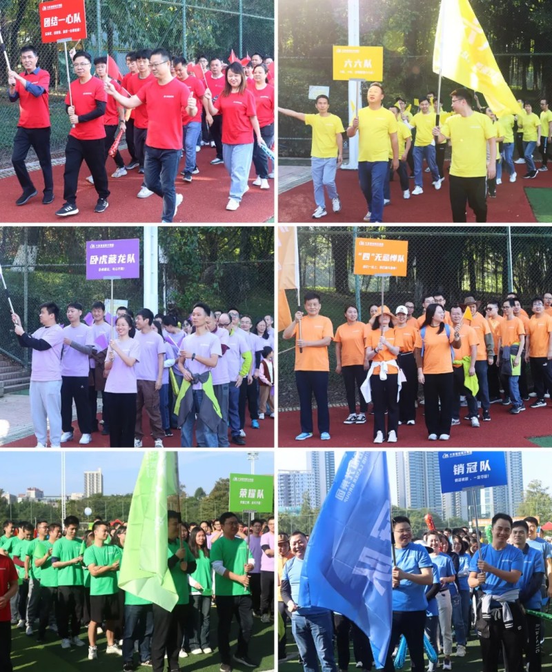 踏著歡快的入場曲,在熱烈的歡呼和掌聲中,“團結一心隊”、“四無忌憚隊”、“榮耀隊”、“銷冠隊”、“臥虎藏龍隊”、“六六隊”,六支隊伍分別身穿紅、橙、綠、藍、紫、黃六種顏色隊服,邁著矯健堅定的步伐依次入場。鮮明靚麗的色彩與飄揚的彩旗交相輝映,粵銘人的活力與斗志瞬間點燃整個賽場。