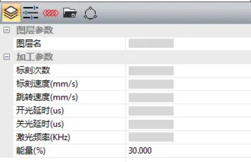 正常開機后,將能量調至30%以下,其余參數不變(操作界面如下圖所示),空打出光預熱約10分鐘,再進行生產加工。