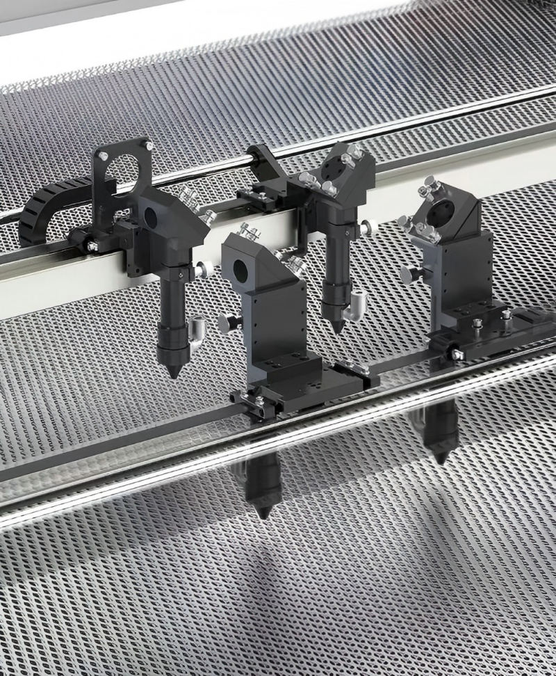 印花紡織激光切割機單個激光頭或兩個激光頭分為前后,分別裝在兩條橫梁上