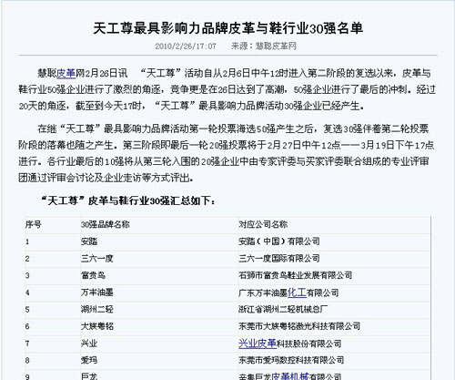 •     粵銘進入天工尊最具影響力品牌皮革與鞋行業30強   -   2010-10-21