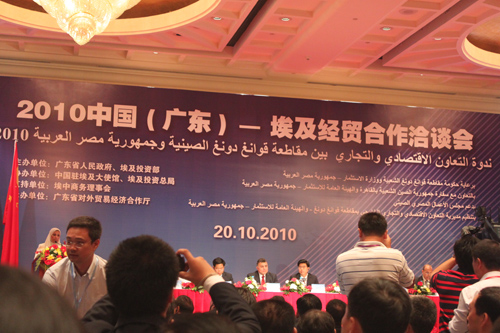 11月20日,“2010中國(廣東)-埃及經貿合作洽談會”在開羅君悅酒店舉行。本次大會由廣東省人民政府、埃及投資部主辦,廣東省外經貿廳承辦,中國駐埃及大使館、埃及投資總局、埃中商務理事會協辦。