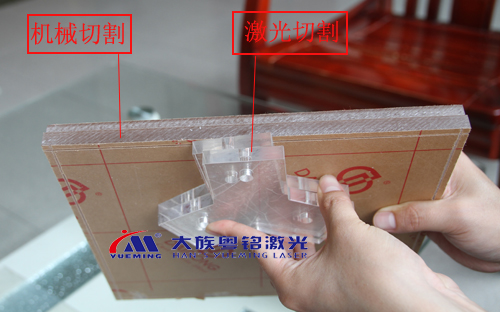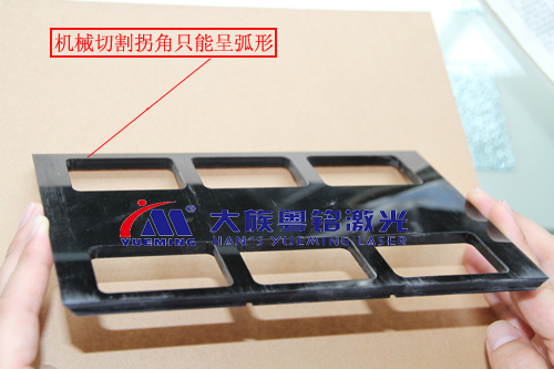 記者在現場用激光切割機和機械切割機切割亞克力做了一個對比。用激光切割的切口是平滑、光潔的,內切拐角可控,無須拋光;而機械切割機加工的切口比較毛躁,內切拐角只能呈弧形,內壁呈霧面,須拋光。