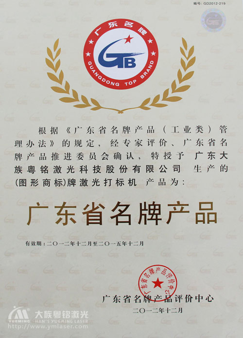 根據(jù)廣東名牌帶動實施方案,廣東大族粵銘激光科技股份有限公司在東莞市質(zhì)量技術(shù)監(jiān)督局的大力支持下,和眾多的客戶鼓勵下,參加了2012年廣東省名牌產(chǎn)品(工業(yè)類)評審,并一舉獲得(激光打標(biāo)機(jī))“廣東省名牌產(chǎn)品”稱號。按照廣東省名牌產(chǎn)品評價體系,大族粵銘激光的激光打標(biāo)機(jī)在市場評價、質(zhì)量評價、效益評價、發(fā)展評價上均獲得高分,特別是在市場評價中得到國內(nèi)外客戶一致好評,企業(yè)內(nèi)部品牌管理工作十分規(guī)范,并具有創(chuàng)新精神。