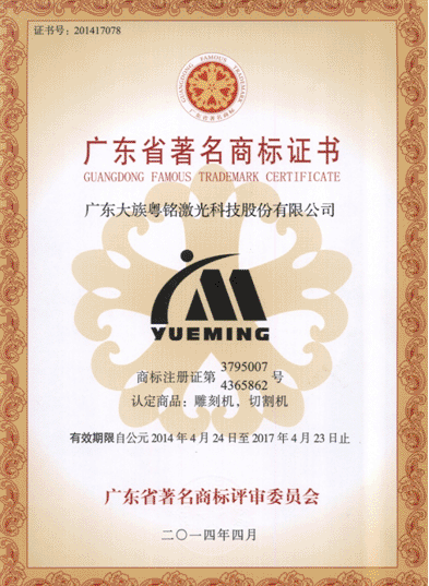 粵銘激光科技股份有限公司傳來(lái)喜訊,經(jīng)過廣東省工商行政管理局、廣東省著名商標(biāo)認(rèn)定委員會(huì)的層層嚴(yán)格考察、評(píng)審及公示,大族粵銘激光“雕刻機(jī)、切割機(jī)”產(chǎn)品成功榮獲“廣東省著名商標(biāo)”。