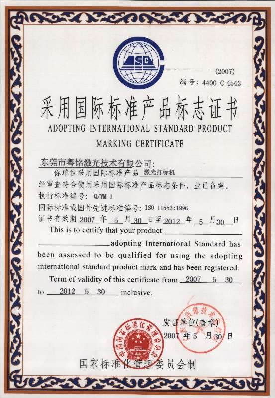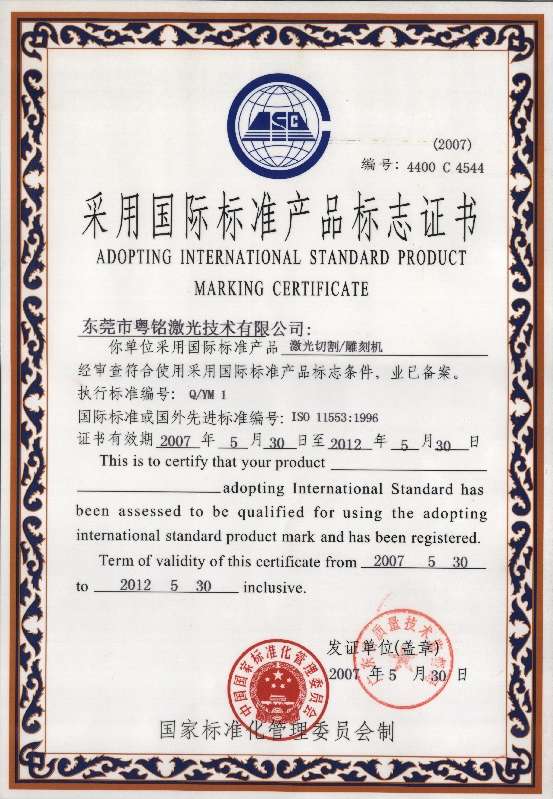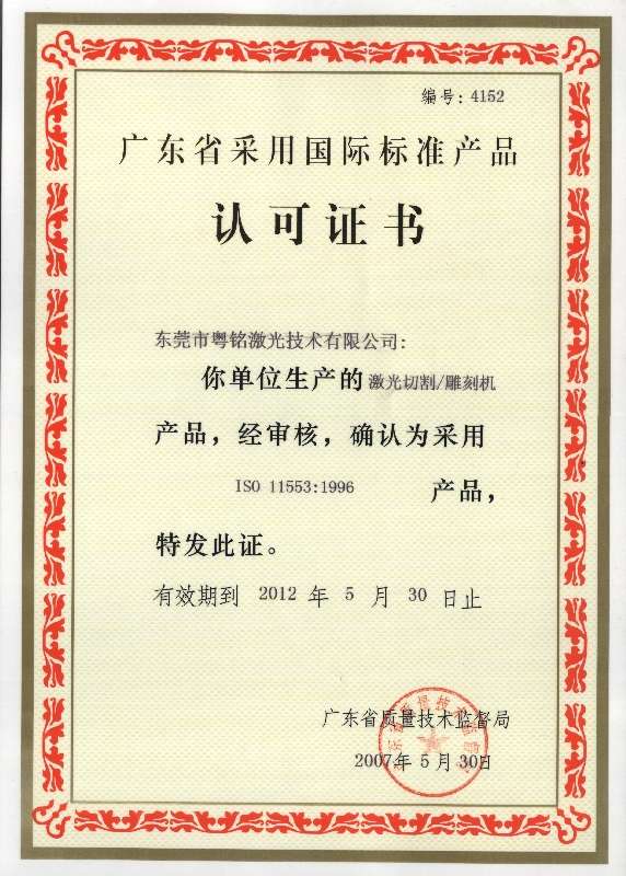 粵銘激光從技術專利化、專利到標準,不僅是在管理上升級,而且,也是企業在市場上競爭制勝的法寶。技術專利化,專利標準化,標準國際化是粵銘激光采標的真正意義。根據廣東省技術監督局批準,粵銘激光自六月四日起產品全部實施采標,所有產品標準將自動升級,這樣更加有利于企業產品參與國際市場競爭。