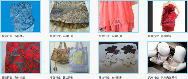 紡織面料、皮革雕花及切割、塑膠材料打標(biāo)、深色材料打標(biāo)。