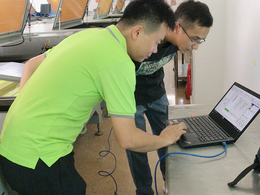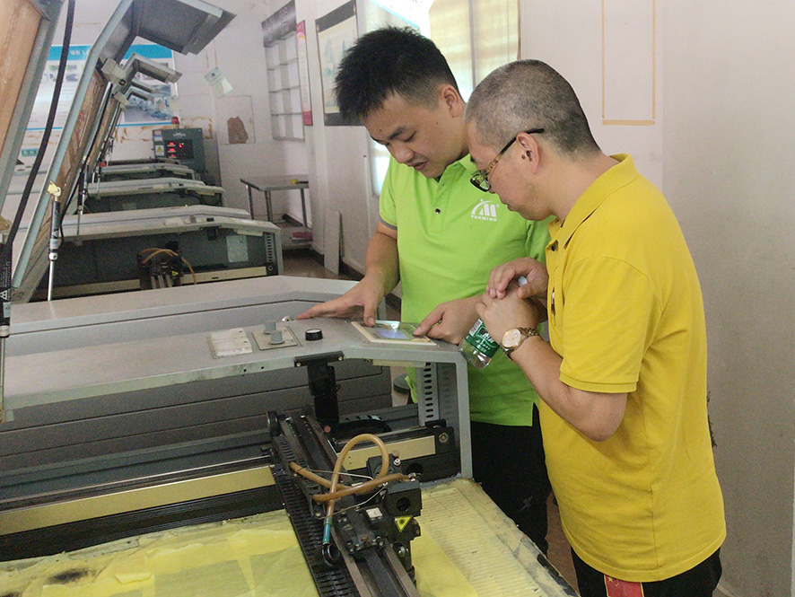 經過兩個多小時的車程,“大族粵銘就在您身邊”售后回訪團隊一行順利抵達目的地,走進客戶現場,一排排整整齊齊的,清一色的大族粵銘激光設備,讓回訪團一行感到由衷的自豪。服務工程師與客戶溝通設備使用情況后,沒有片刻休息,立即對客戶的激光設備進行了全方面的維護保養,給出了專業的使用指導,并現場對故障機器進行了全面維護。