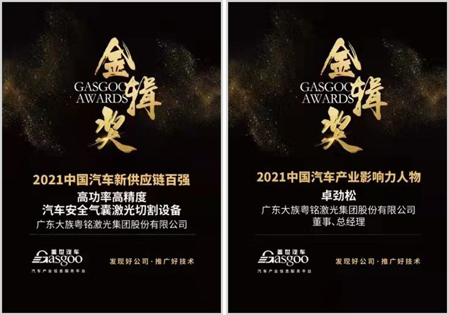 大族粵銘激光集團(tuán)憑借打破歐美技術(shù)壟斷的第四代高功率高精密安全氣囊激光切割機(jī)(HCM3015C-DF-A),榮獲2021蓋世汽車(chē)“中國(guó)汽車(chē)新供應(yīng)鏈百?gòu)?qiáng)”。大族粵銘激光集團(tuán)執(zhí)行董事兼總經(jīng)理卓勁松先生獲評(píng)2021中國(guó)汽車(chē)產(chǎn)業(yè)影響力人物。