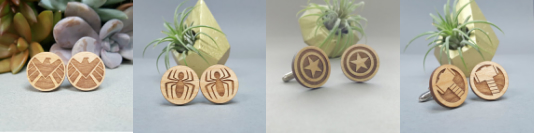 不同英雄人物的代表標志通過電腦軟件上制圖后,工藝品激光雕刻機就輕松地在電影周邊袖扣上雕刻。