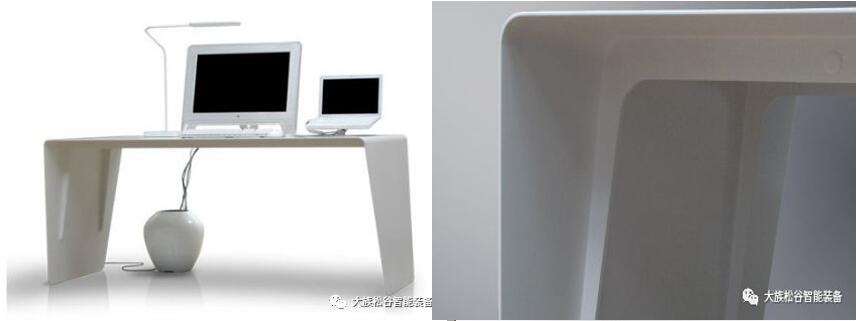 片圓形的金屬片,1 片作為桌面,8 片作為底部支撐,這是意大利設計師魯道夫·多多尼設計的Still 咖啡桌。每個金屬片只有5 毫米厚,由激光切割而成,表面有PVC 保護層,整個桌子質量非常輕,但絲毫無法掩飾其工藝的精致巧妙,以及極簡風格中散發著的優雅氣質。整個的辦公桌是用激光切割3.5毫米板鋼,不使用螺絲或連接部件,只用兩根肋骨支撐,典型的極簡主義的風格。